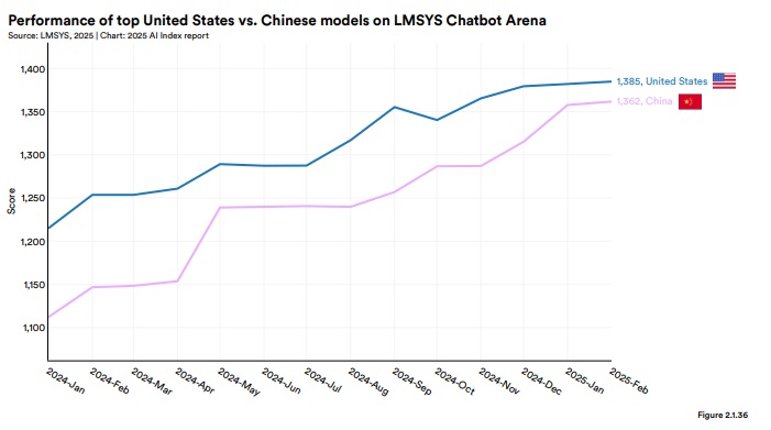 Obra: Artificial Intelligence Index Report 2025. Chapter 2. Technical Performance. US vs. China Technical Performance. Stanford HAI, 2025, Stanford University. Por The Stanford Institute for Human-Centered AI.